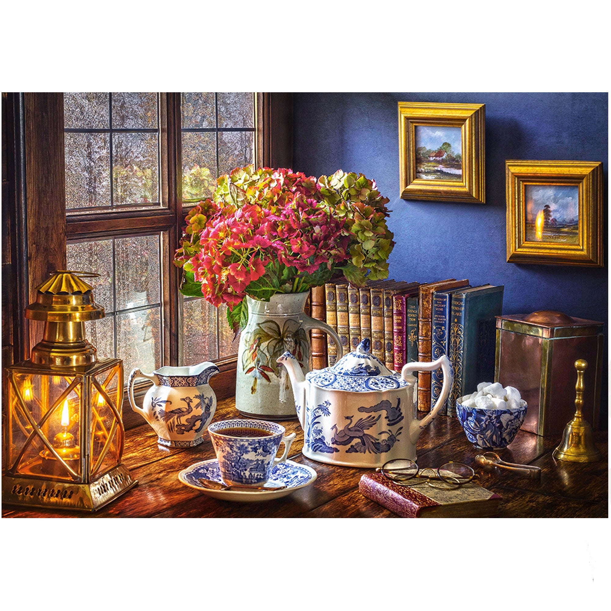 Bordet är dukat för en lugn testund med massor av fina detaljer. Pussla fram den vackra buketten, böckerna, ljuslyktan och alla andra små saker - ett pussel med massor att upptäcka.