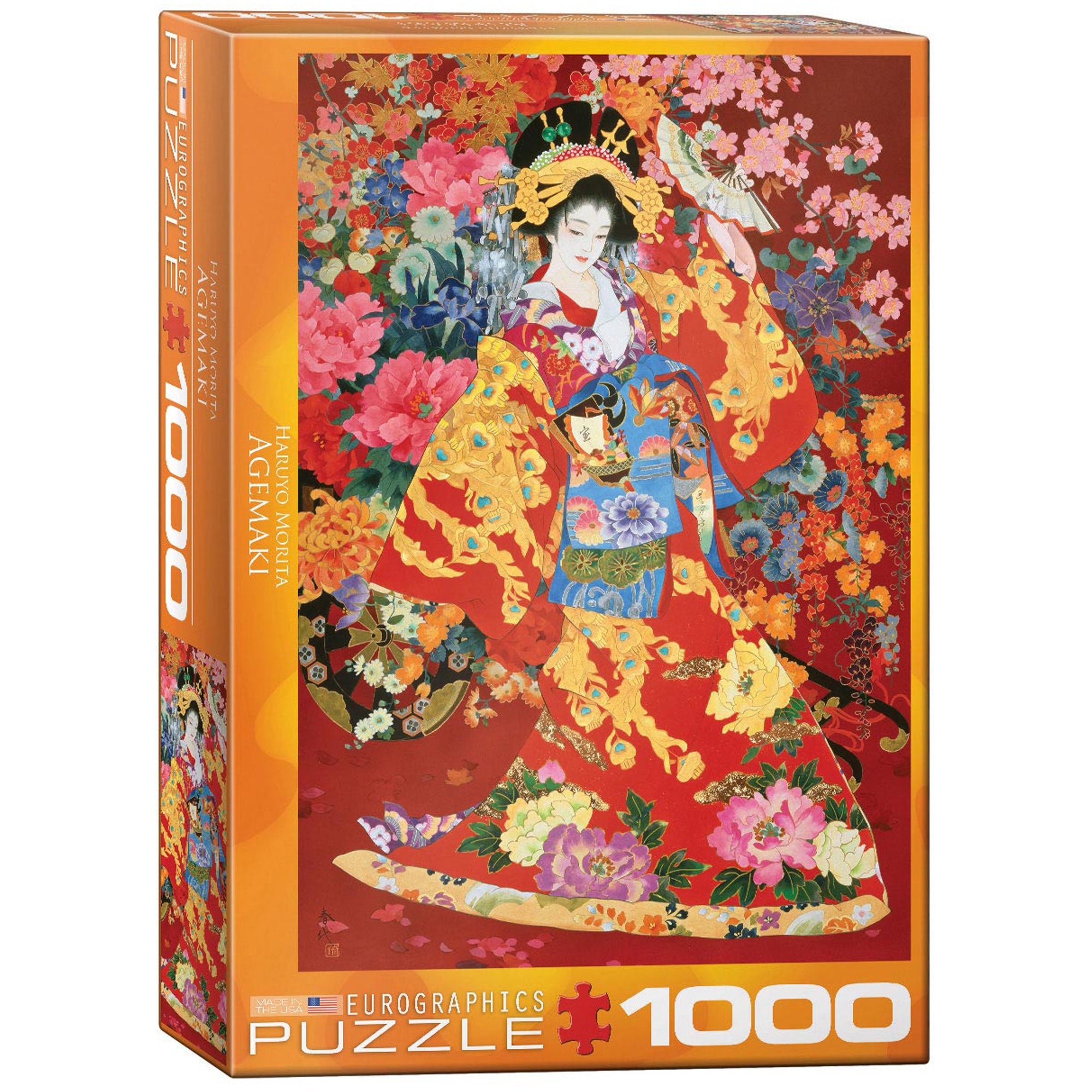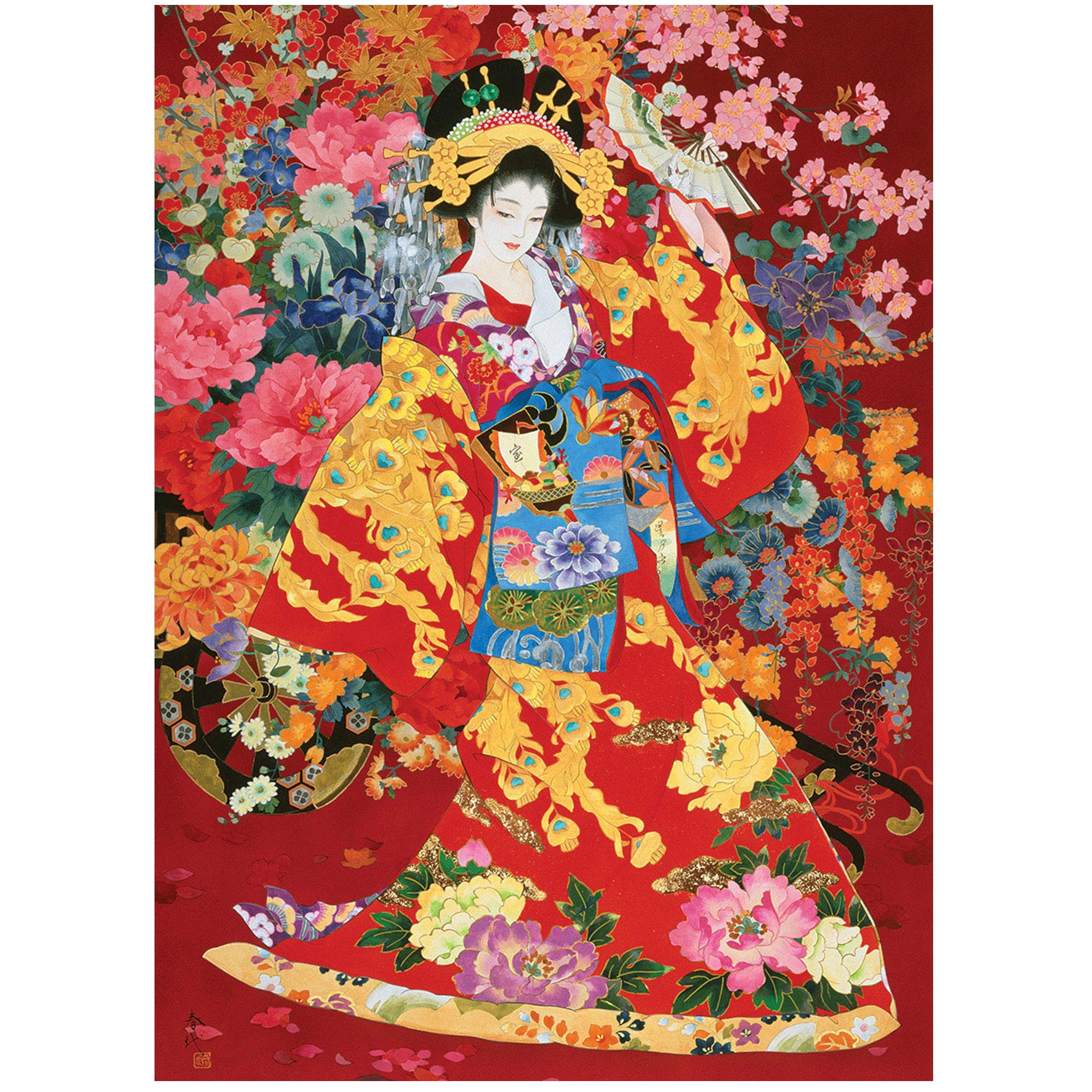 Ett pussel men ett motiv av Haruyo Morita som föreställer en färgstark och detaljrik japansk kvinna.